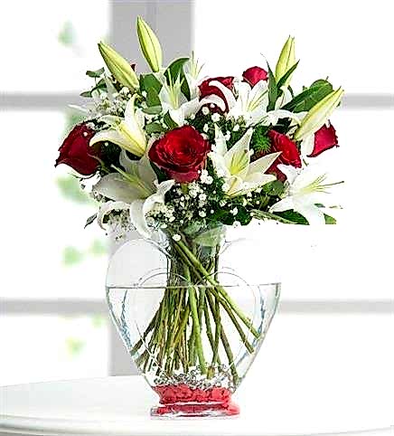 Kalp Cam içerisinde Kırmızı Güller ve Beyaz Lilyumlar - 3.000,00 TL
